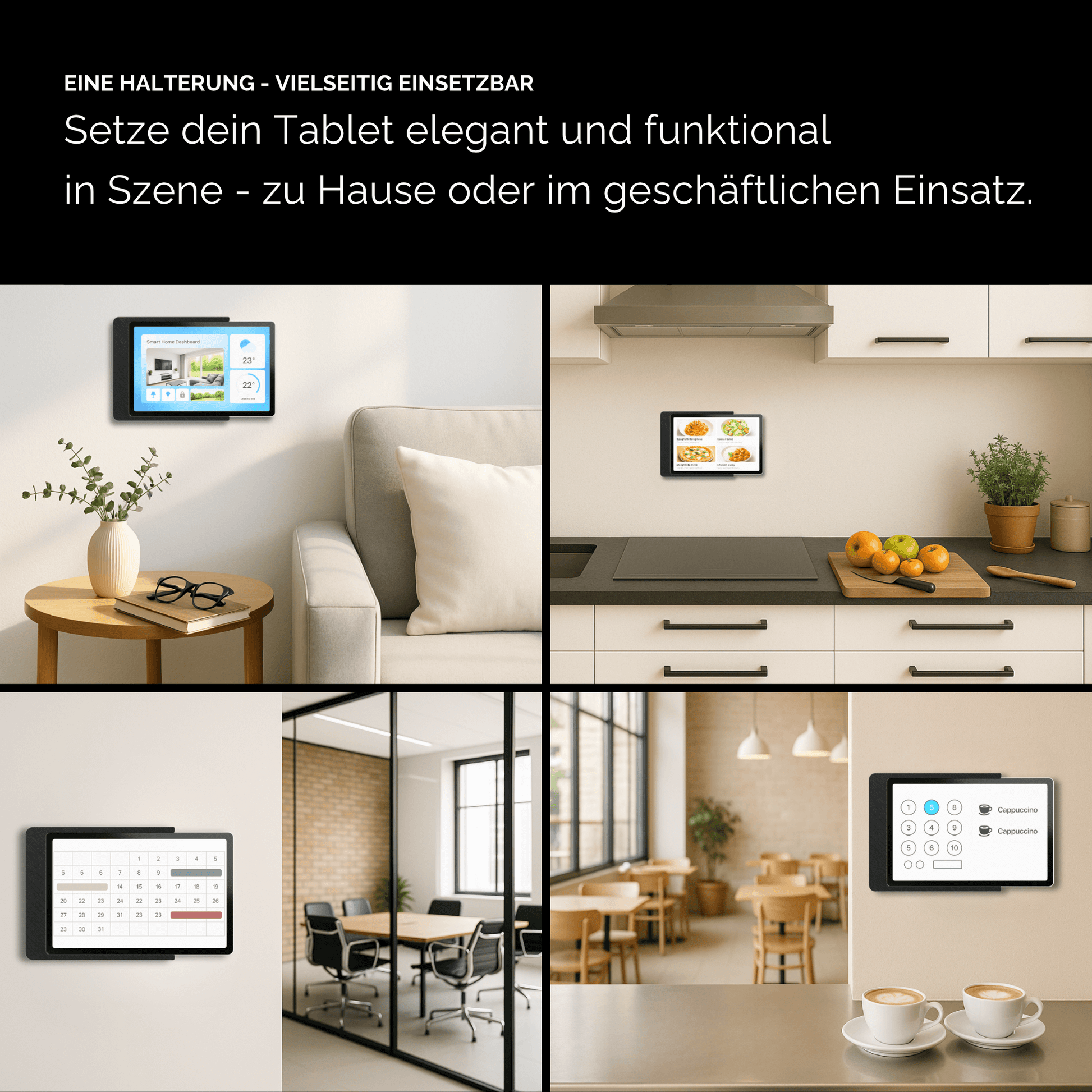 Die Tablet Wandhalterung fügt sich nahtlos in Empfangsbereiche, Lobbys oder Cafés ein und macht dein Tablet zum Info‑Terminal, digitalen Check‑in oder Raumkalender. Diese Wandhalterung fürs Tablet bleibt dezent, wirkt aufgeräumt und funktional und bleibt griffbereit.